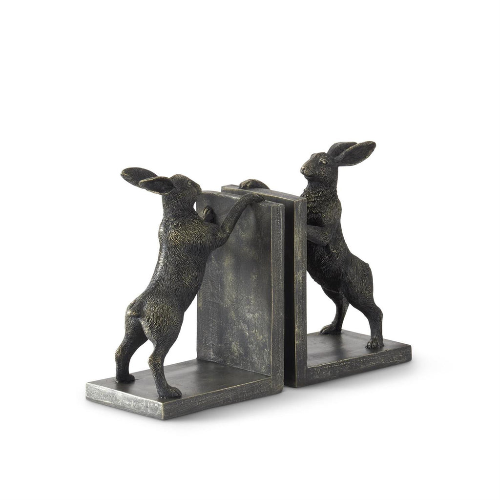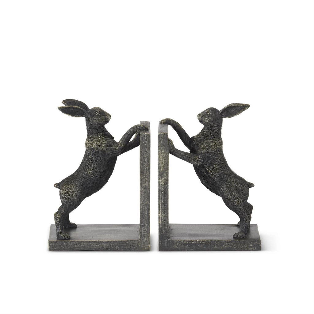 Add a touch of elegance and whimsy to your shelves with this set of 2 black and gold resin rabbit bookends. Measuring 8.75 inches each, they provide sturdy support while enhancing your décor with their sleek, sophisticated design. Perfect for organizing books or displaying collectibles, these charming bookends combine functionality with artistic flair to elevate any room.