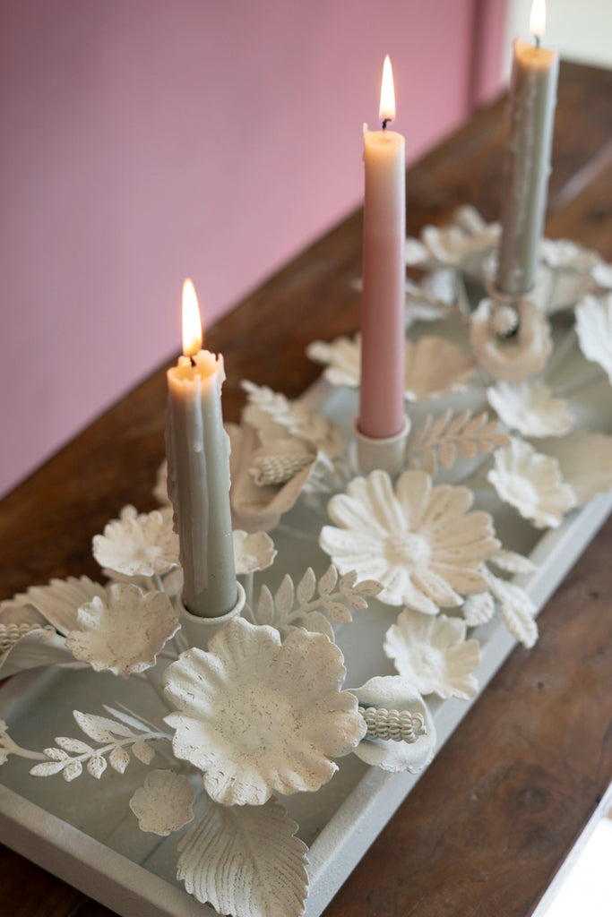 This painted metal floral taper candelabra holds three taper candles. It is made of painted metal in the shape of open blooms. Set one atop a low shelf or table for everyday decor.