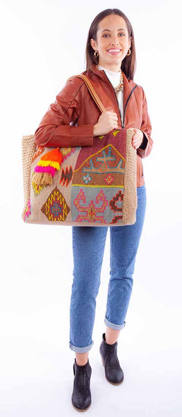Tote bag featuring colorful bright patterns and tassel. Double straps
