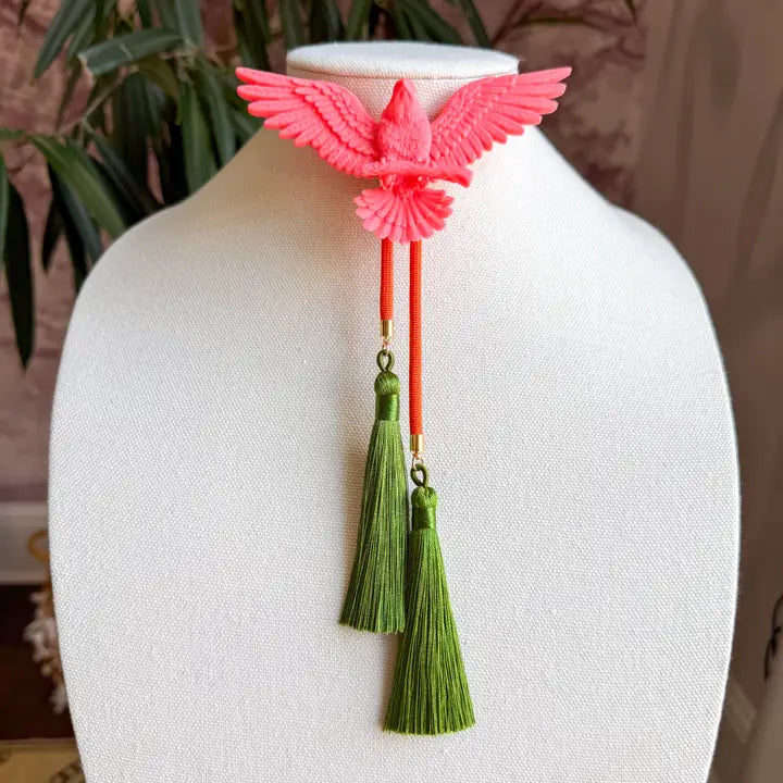 Celebrate freedom in full color. This striking bolo showcases a glittering eagle — a symbol of strength and independence — soaring boldly at your collar. Two vibrant silky tassels add a spirited pop of color, swaying with every move like banners in the breeze. Perfect for adding a touch of Americana to your outfit — Pair it with denim, boots, or your favorite white tee — this piece brings a spark of hometown pride and a wink of rebel style wherever you roam. Fly free. Fly bold. - 44 inches adjustable cord - eagle measures 4.75 inches wide - 100% polyester paracord - brass hardware
