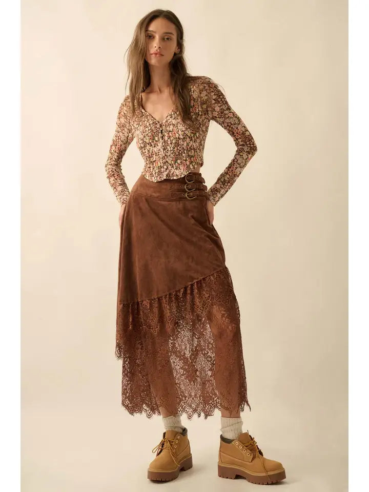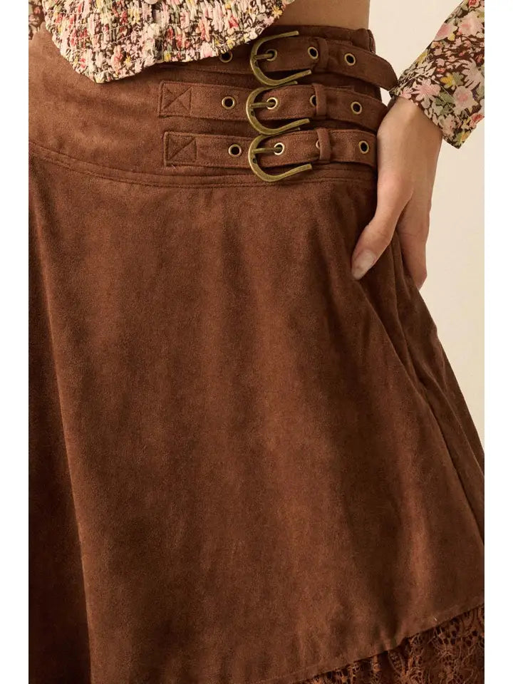 A faux suede and lace maxi skirt with the following features: Wide yoke waistband with buckled straps. Asymmetrical skirt. Tiered lace hem. Ankle length. Relaxed fit.