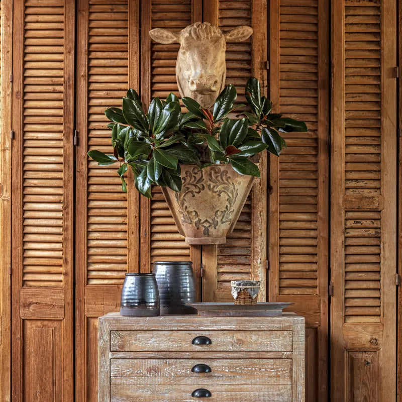 This aged metal harvest basket is great filled with your favorite dried botanicals paired on either side of a mirror or piece of art. They are also beautiful hung on a old door or shutters.