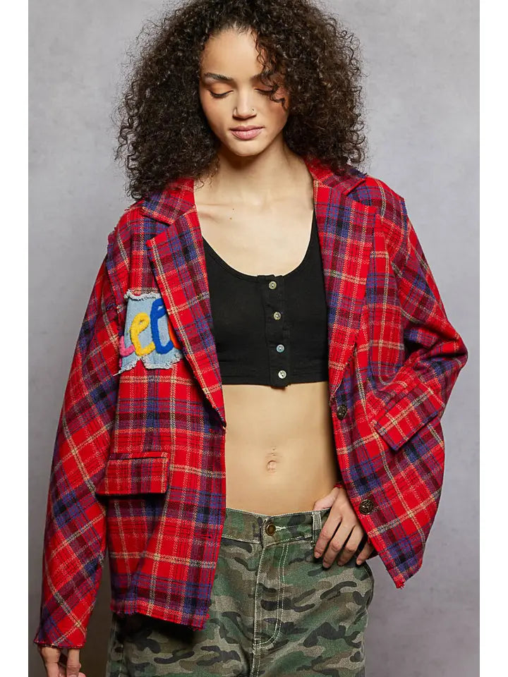 Designed in jacket, full sleeve, relaxed fit top in woven with patch detail pointed plaid pattern.