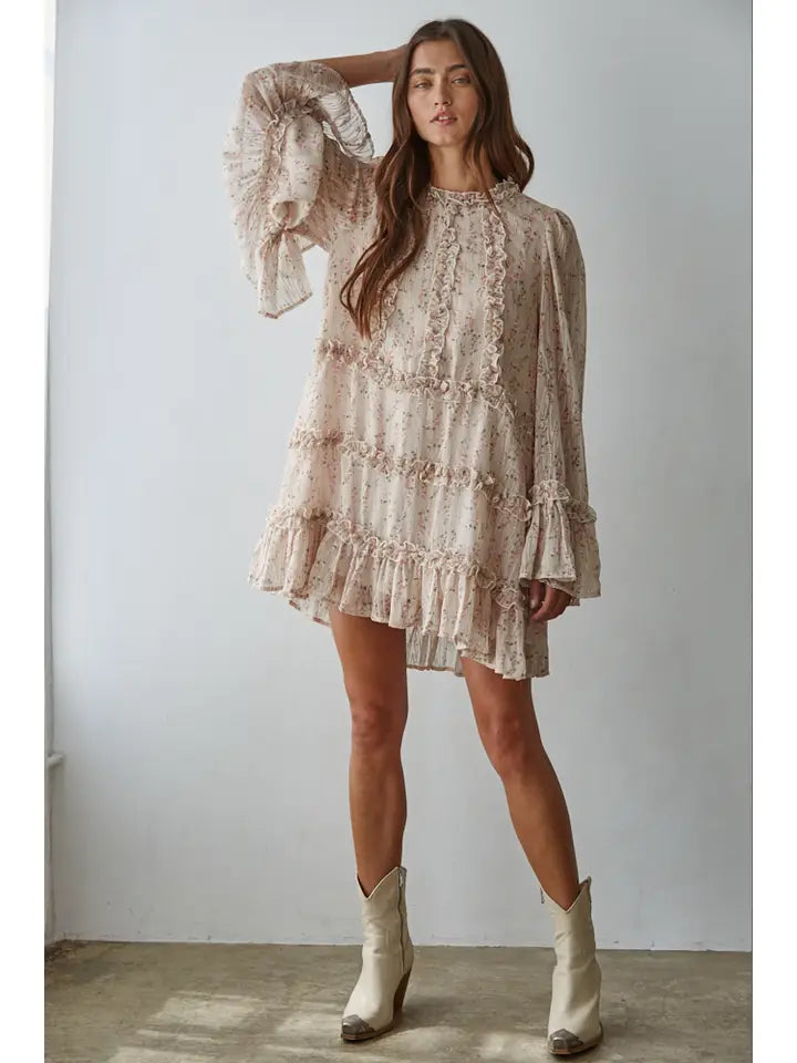 Woven Polyester Floral Print Long Sleeve Round Neck Ruffle Detail Mini Dress with Back Zipper and Rayon Lining