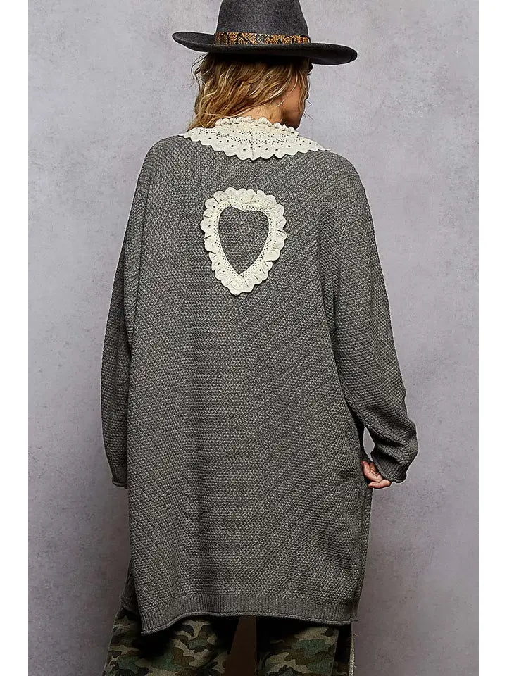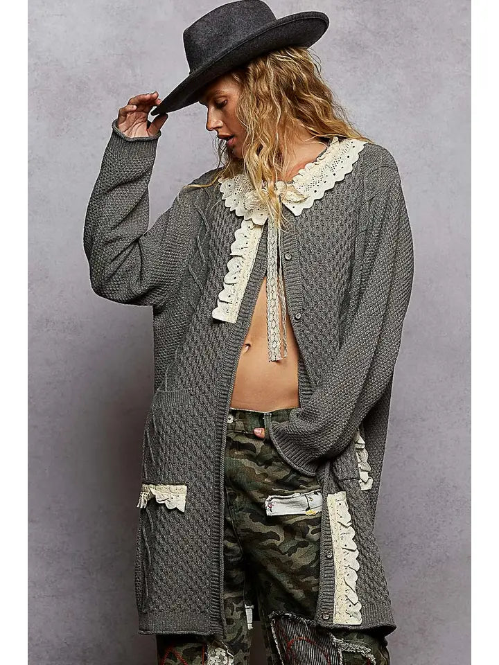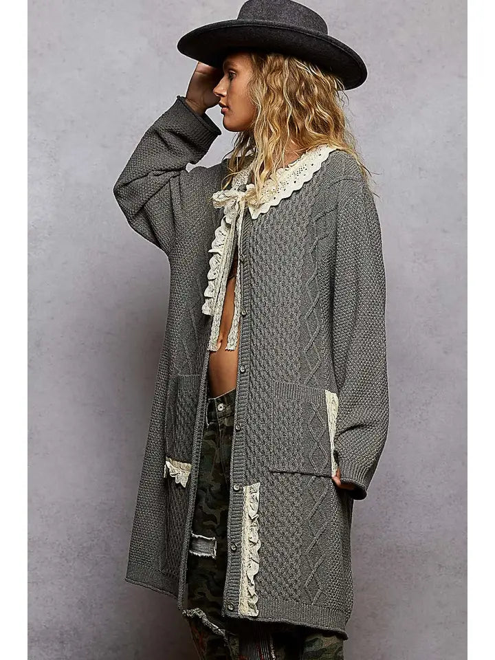 Designed in V-neck long sleeve maxi cardigan in acrylic with varied cable knit patterns, ruffled lace detailing, and accented novelty button closure.