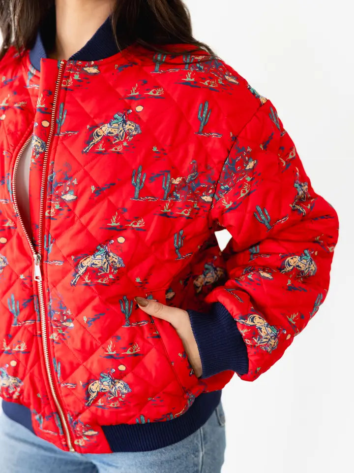 The Western Wild Quilted Bomber in Red makes a bold outerwear statement with playful cowboy graphics and functional warmth. This fully quilted jacket features an allover vintage rodeo print with bucking broncos, cacti, and desert motifs. Made in a vibrant red base, the jacket includes navy ribbed knit trim at the collar, cuffs, and hem for a classic bomber finish. Side slit pockets and a full-length front zipper complete the look, offering comfort and easy layering for cooler weather. Key Features: * Material: Quilted woven outer with light padding * Print: Multicolor cowboy and desert scene on red base * Closure: Full-length metal zipper * Trim: Navy ribbed knit collar, cuffs, and hem * Pockets: Two side slit pockets * Fit: Cropped bomber silhouette