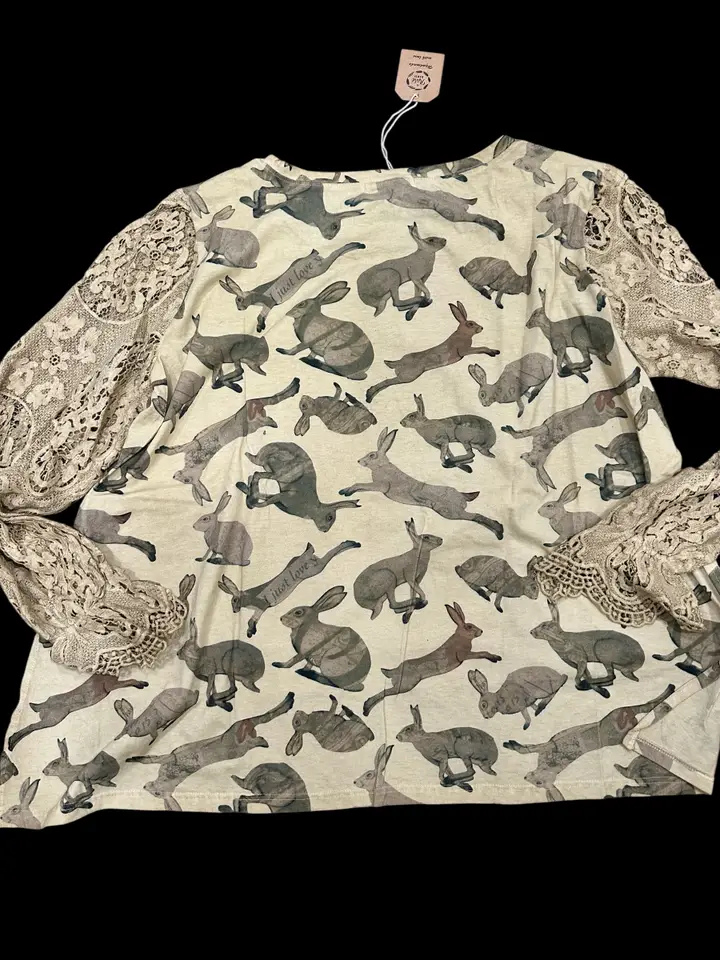 Amazing 100% cotton high low shirt is running away with bunnies! A large patchwork flower embraces the front while the gorgeous lace sleeves finish the look. Not just for Easter but our bunnies are for all year long! One size.