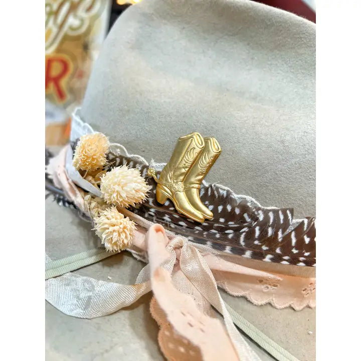 Brass patina cowboy boots hat pin with a dark wax to seal in the patina Measures about 1 3/4' tall Pin back for easy removal & switching to other hats