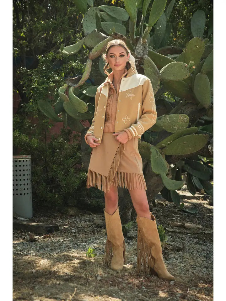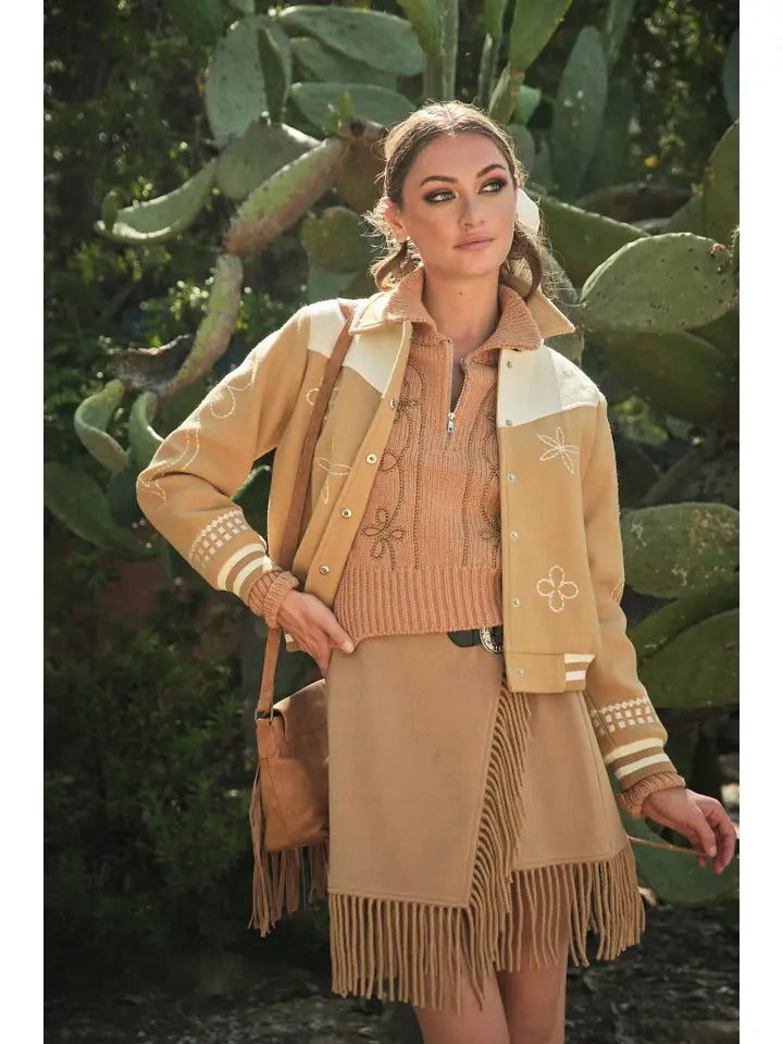 Varsity-style bomber jacket with floral embroidery, striped cuffs, and contrast yoke details for a western-inspired look 100% Polyester