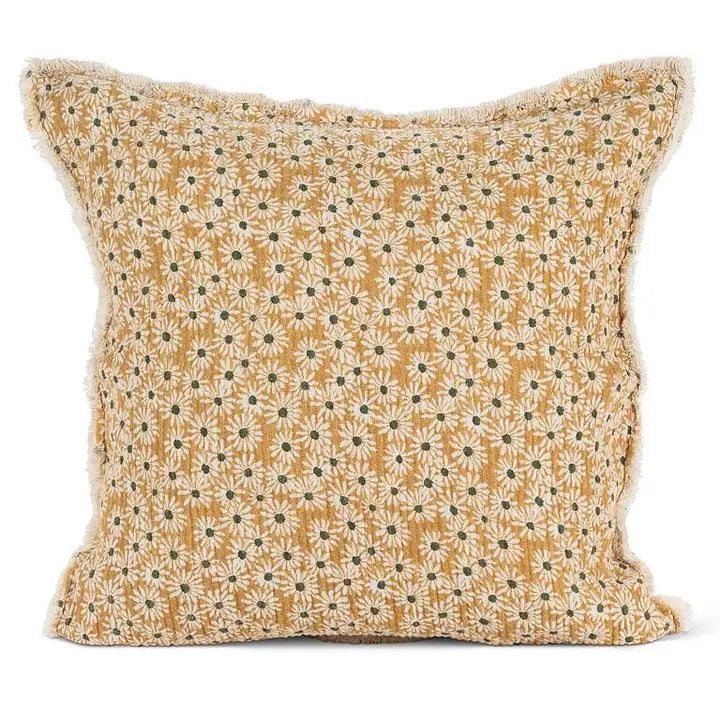 This square throw pillow features a textured daisy applique on a soft yellow background. The combination of cotton and polyester provides a comfortable, supportive accent for sofas, chairs, or beds.