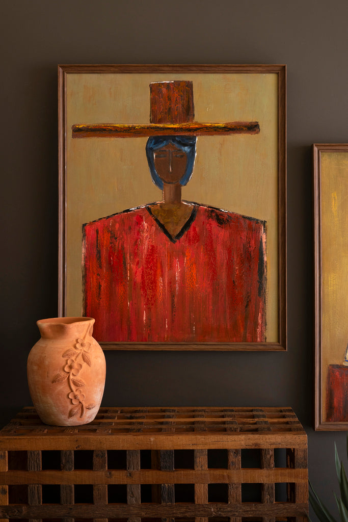 This artwork captures the quiet strength of the Southwest with its warm tones and bold brushstrokes. The woman’s steady gaze and flowing lines create a sense of calm, while the layered paint details add soft texture. Framed in natural wood, it brings a grounded, artful presence to any room.