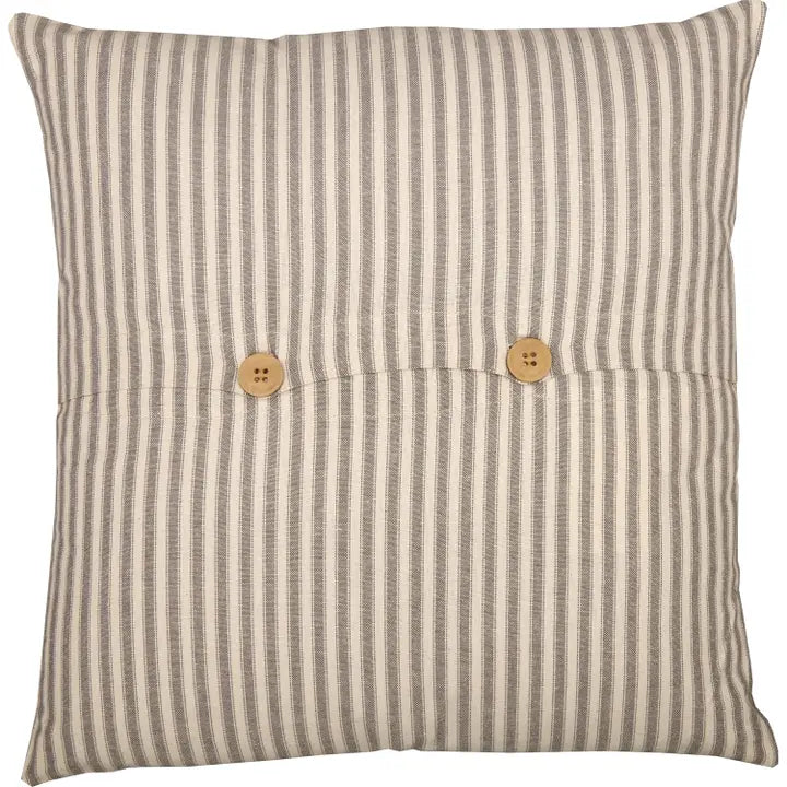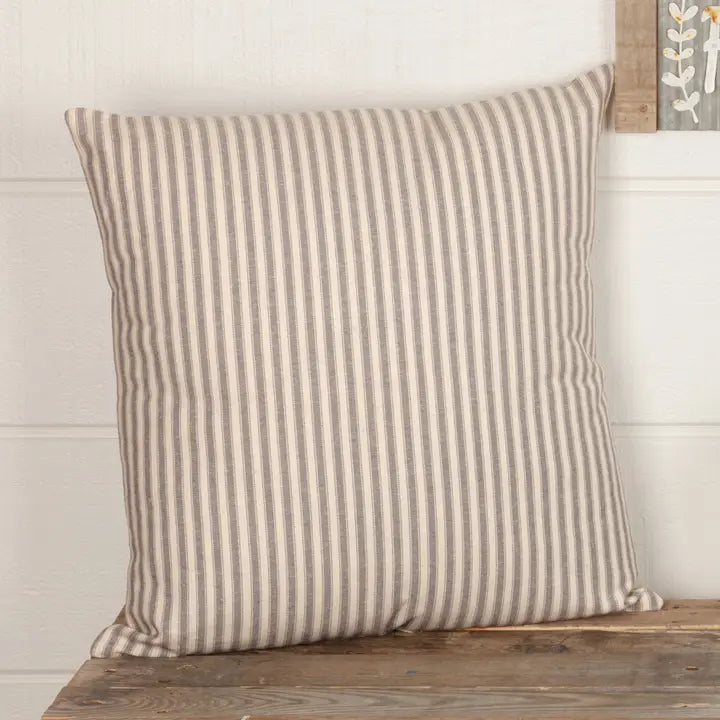 Creme and nickel gray ticking stripes create a light, neutral accent piece that encapsulates modern farmhouse style. The Grace Ticking Stripe Pillow measures 18x18 inches for a versatile decorative pillow. Reverses to button-style closures for easy cleaning. Constructed from 100 percent cotton with a polyester fill. Machine washable and iron safe. Includes: 1 x Pillow Care Instructions: Machine Wash, Tumble Dry Low, Iron Safe Material: 100% Cotton Shell, Polyester Pillow Fill
