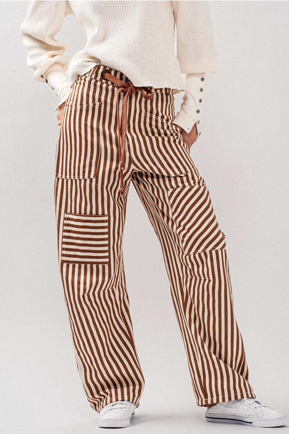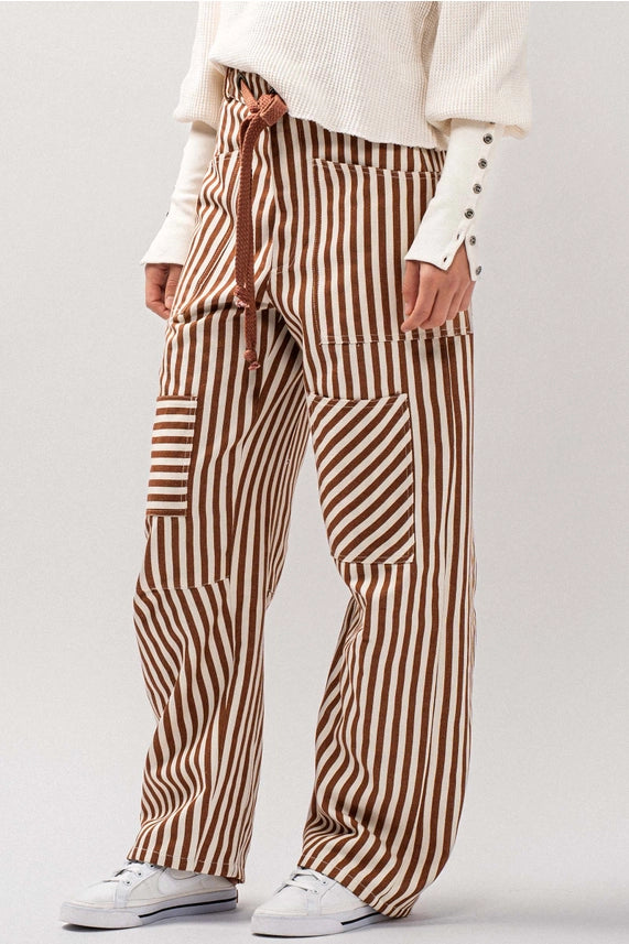 Workwear-inspired pants featuring classic railroad stripes and uniquely angled utility pockets. The drawstring waistband and relaxed fit create a casual silhouette perfect for everyday styling. Taupe.