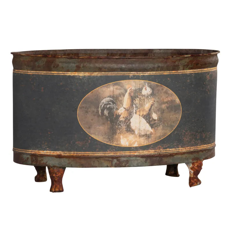 The French Farm round Tole container has a perfectly aged finish. This Classic French Farm scene will make you want the entire collection with this scene. Filling this container with live plants you will elevate your design style.